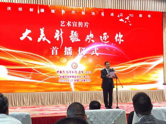 在这一历史节点上,中国民族贸易促进会文化交流委员会推出这部宣传片,既展现新疆各族儿女建设美好家园的辉煌成就,也弘扬各民族和衷共济的共同体精神,向祖国献上深情的祝福。在仪式现场,来自自治区相关部门的领导、中国民族贸易促进会和新疆民族贸易促进会等单位负责人、社会各界百余嘉宾共同见证了这部宣传片的首播。