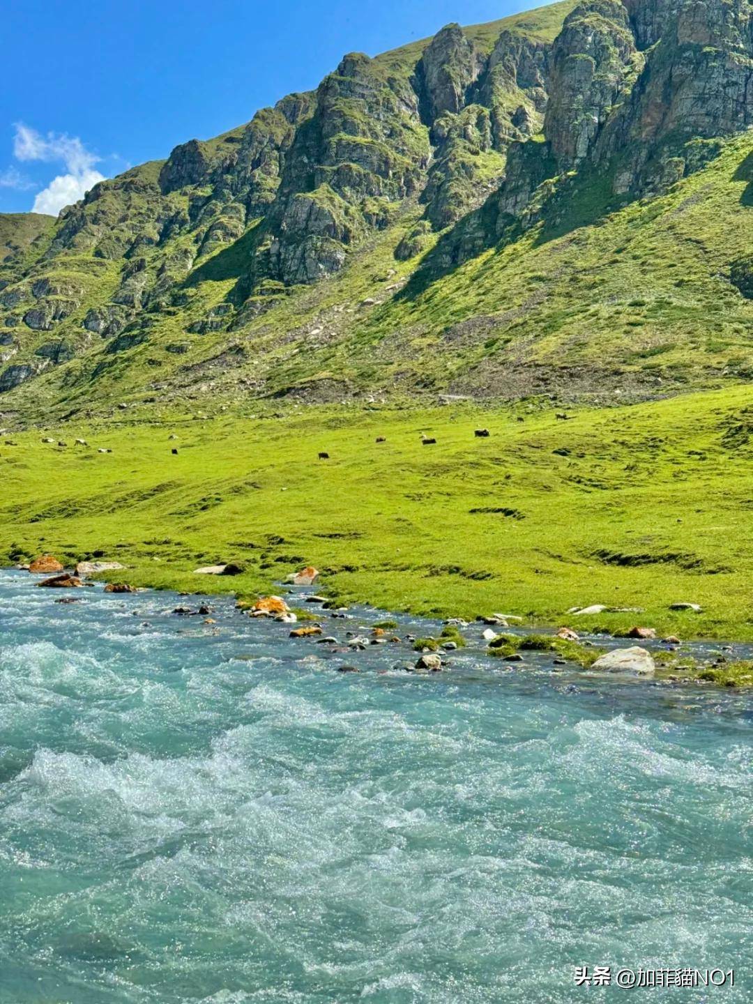 那拉提草原是世界四大草原之一,山峦起伏、绿草如茵,牛羊像星星一样撒在旷野上。如果是六七月份来,还能赶上漫山遍野的野花。