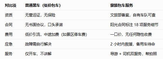 车辆相关:油费、过路费、保养费、停车费人员服务:司机服务费、食宿费、导游费安全保障:800 万意外险、车辆故障救援贴心赠送:每日矿泉水、零食补给、景点讲解四、避坑预警:普通黑车 vs 蒙旅包车实测对比