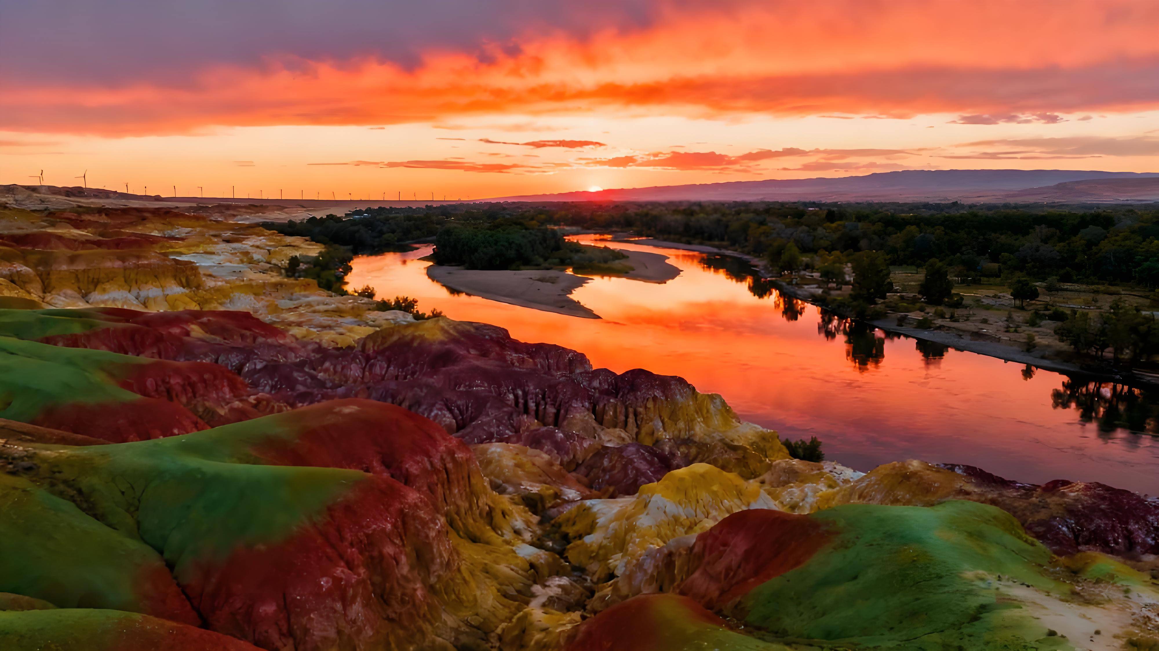 五彩滩的日落那叫一个绝,就像大自然在变魔术!4.4 分的评价配得上它傍晚的绝美景色。站在额尔齐斯河边,对岸是绿油油的草地,这边的雅丹地貌被夕阳照得红的、紫的、黄的,颜色一层一层的。河水把两边的景色都倒映出来,一边生机勃勃,一边苍茫辽阔,特别震撼。虽然木栈道上不让飞无人机,但在周围找个地方航拍,能拍到弯弯的河道像银色丝带,彩色的山丘像宝石一样散落的超壮观画面。