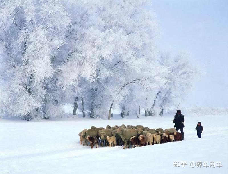 一夜大雪,整个世界银装素裹一位老人带着乖孙孙雪地放羊