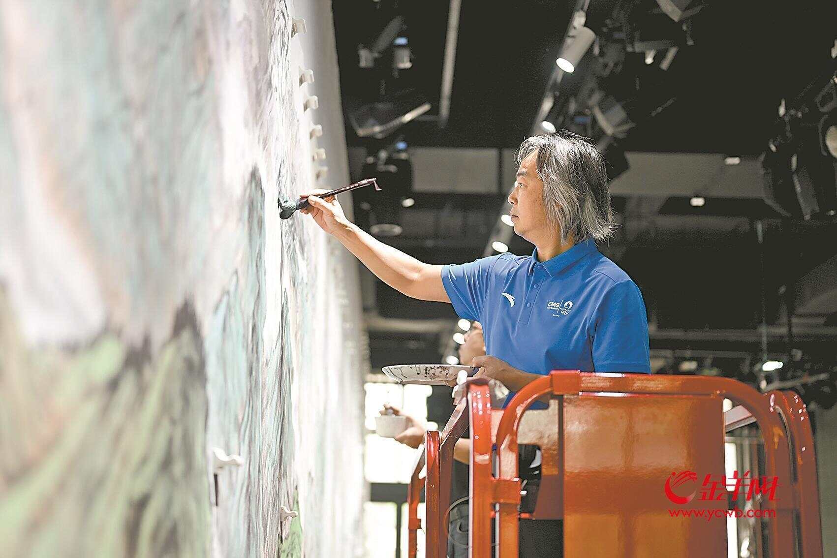 在创作阶段,多位艺术家针对青绿山水的岭南绘画技法、材料展开研讨,在点、线、面的穿插布局中体现层层造势之美感。由于画作尺幅较大,艺术家们尤其注重在粗细线条、色块组成的对比中突显现代性笔触。