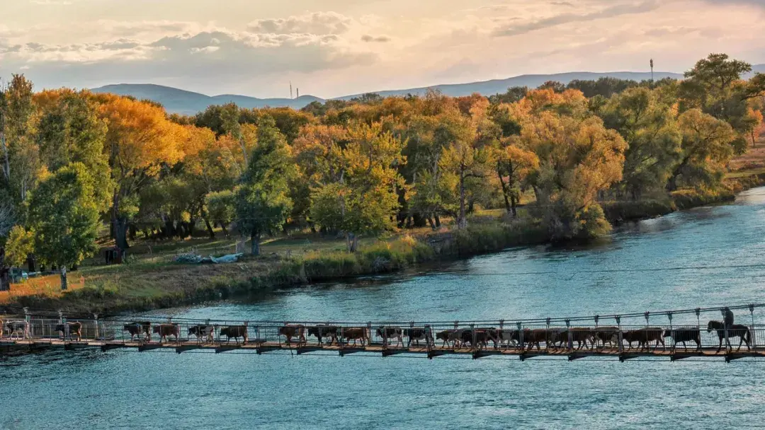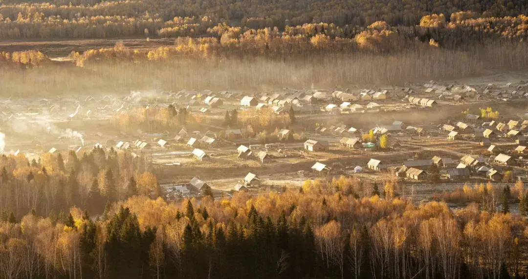 布尔津镇,位于阿勒泰地区,三面环水、地势平坦,海拔472米,沿岸有茂密的杨柳和白桦林,小镇则隐藏于其中,显得静谧而独特。