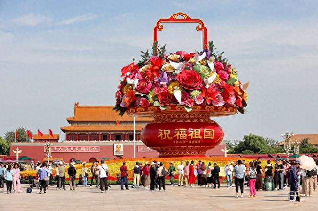 9月26日,北京,天安门广场“祝福祖国”花坛以喜庆的花篮为主景,吸引游客观赏拍照。视觉中国供图