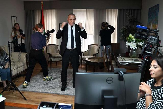 9月21日,英国伦敦,巴勒斯坦驻英国使团团长胡萨姆·佐姆洛特(中)观看电视直播,内容为英国首相基尔·斯塔默正式承认巴勒斯坦国。近日,英国、法国、加拿大、澳大利亚、葡萄牙等多国宣布承认巴勒斯坦国。视觉中国供图