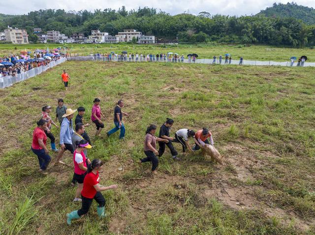 9月26日,广西梧州,2025年梧州市庆祝“中国农民丰收节”系列活动在岑溪市南渡镇举办,村民们在参与抓猪游戏。视觉中国供图