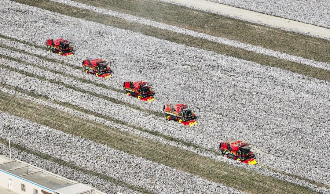 ▲金秋时节,在新疆库尔勒市普惠农场一处棉田,农民驾驶大型采棉机采摘棉花。新华社记者 李响摄