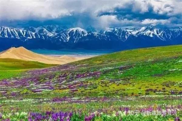 博尔塔拉蒙古自治州境内的赛里木湖草原进入最美的季节,山花如海,绿草如茵,雪山如银,平湖如镜。广袤的草原在雪山掩映下,处处绿草如茵,鲜花盛开,构成一幅优美和谐的天然画卷。