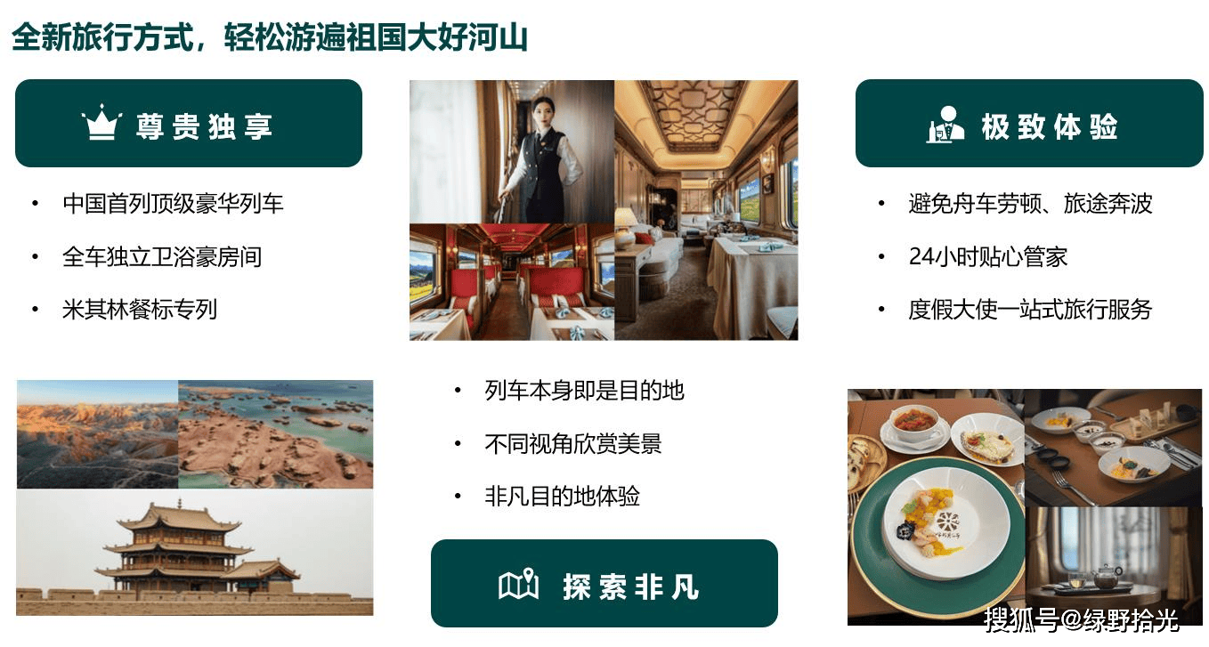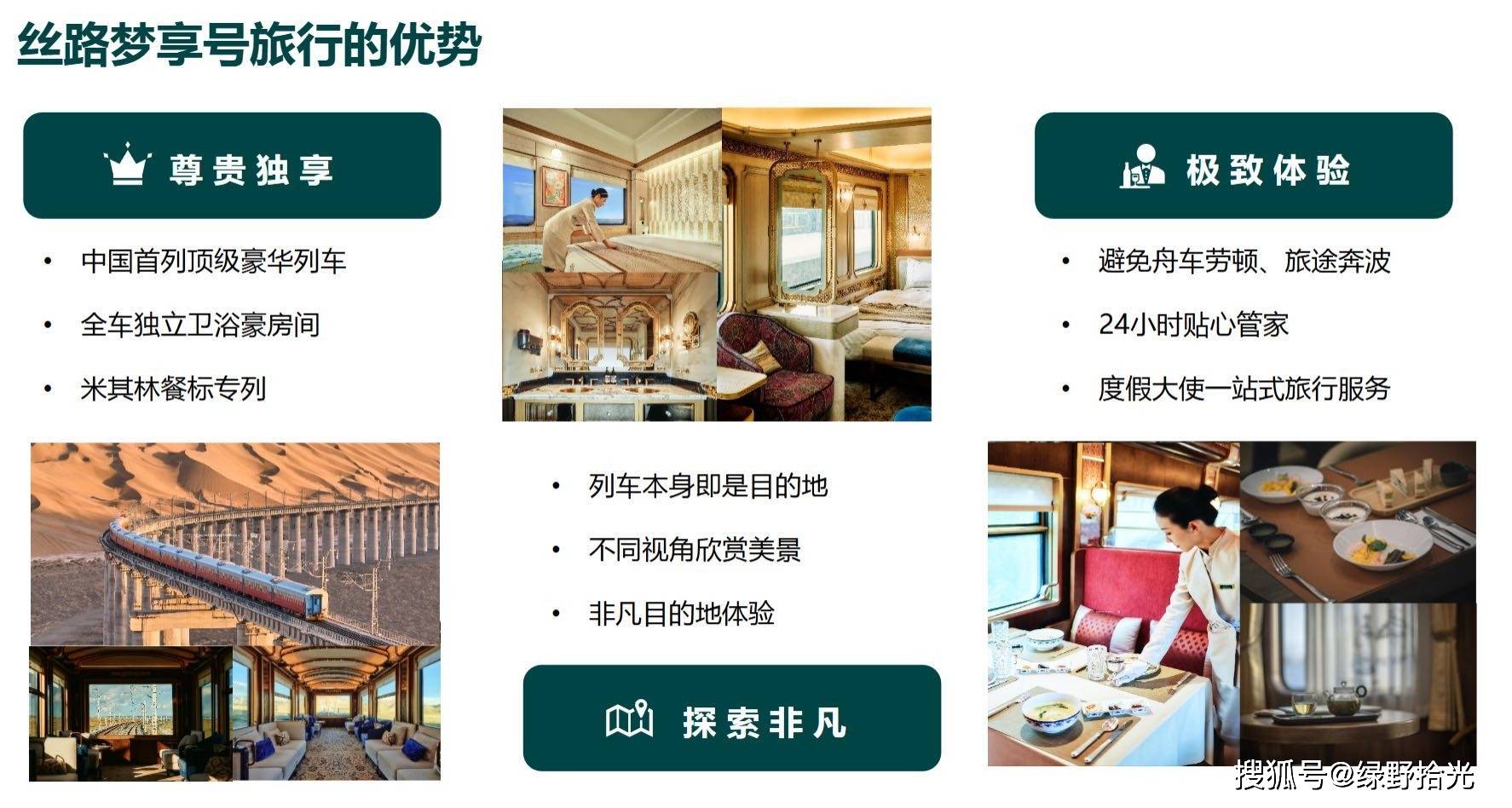 丝路梦享号是国内首趟以丝绸之路为主题的世界级高品质顶奢列车,它将东方美学和丝路文化完美融合,为乘客提供沉浸式体验青海-甘肃-新疆大环线的自然与人文的旅行服务。列车由15节车厢组成,包括全独立卫浴卧房车厢、客厅沙龙车、中西式餐车以及多功能车厢等,满足乘客的多样化需求。此外,列车上还配备了专业的服务团队,为乘客提供24小时的贴心服务。丝路梦享号顶奢国际旅游列车客服预订电话:0991-2860989 2860992 2375552 2375553