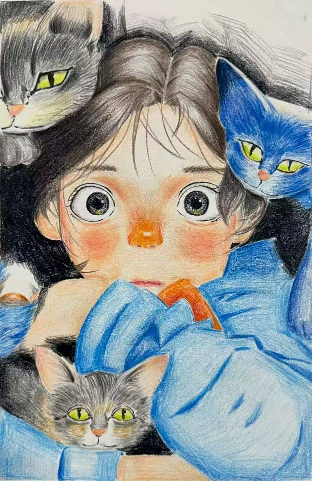丽水市城西中学初一学生陈孜璇的作品荣获优秀作品奖。在这幅彩铅作品中,她以细腻入微的笔触描绘了小女孩与三只猫的温馨场景:女孩大眼灵动、神态纯真,三只猫咪或好奇张望,或亲昵依偎,人与动物之间的温情互动被刻画得淋漓尽致,跃然纸上。