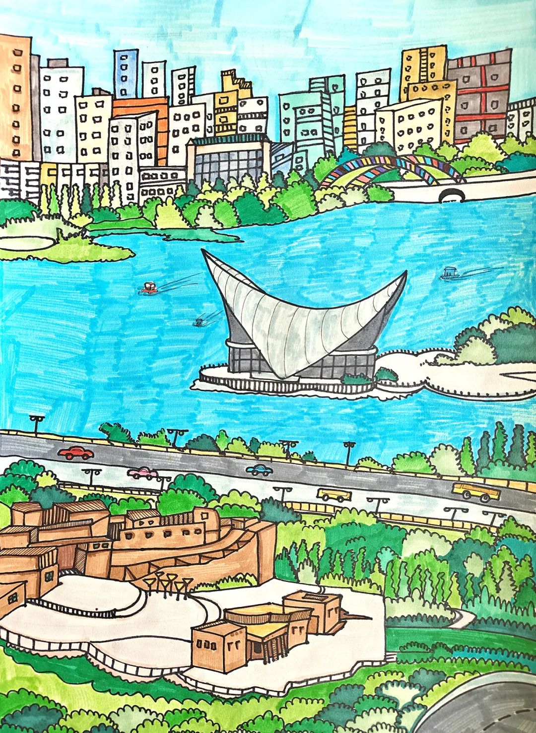 麦迪乃家住喀什市文化路,成长过程中亲眼见证了这座城市的日新月异。在她的画中,东湖碧波荡漾,绿树环绕,现代化的城市规划展示馆、彩虹桥与古老的高台民居相映成趣。“市区新建了很多高楼,还建了科技馆、万达广场,游乐设施也焕然一新,古城也越来越热闹。”说起这些变化,麦迪乃满是自豪,因为这些都是她日常生活中看到的场景。