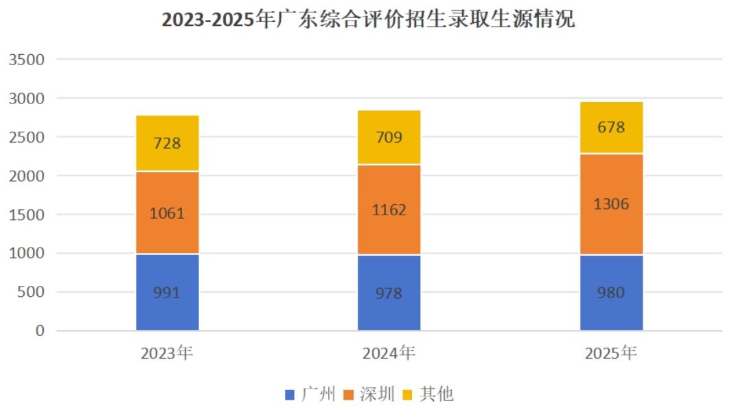 “广东综合评价招生录取名单”显示,近3年录取考生70%来自广州和深圳。2025年,980名广州考生、1306名深圳考生通过综合评价被高校录取。