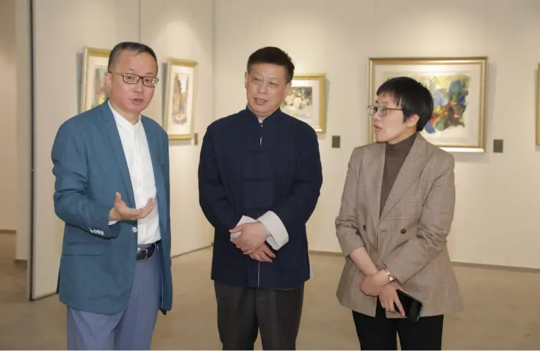 著名策展人胡晓芒(左)向上海市文联专职副主席、秘书长沈文忠(中)与上海市文化和旅游局副局长萧烨璎(右)介绍本次联展相关情况