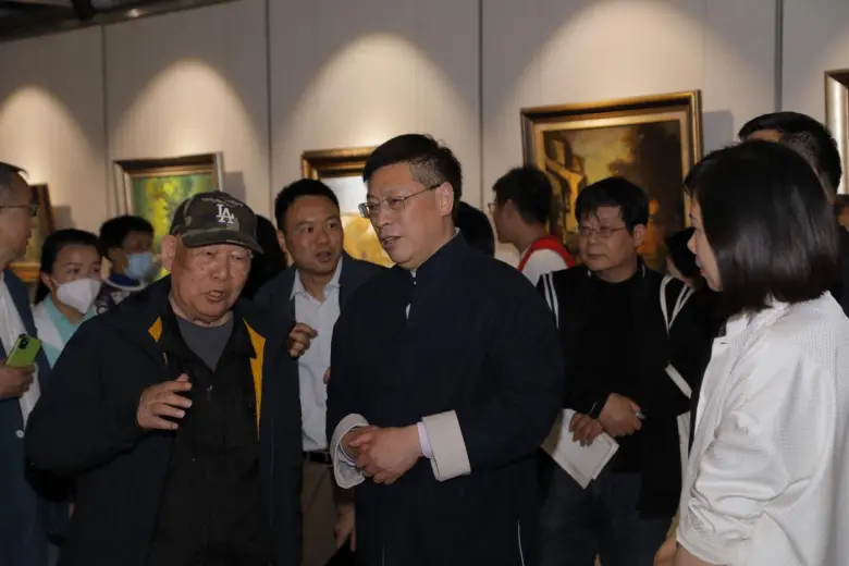 开幕活动现场,著名油画家万福堂(左)向上海市文联专职副主席、秘书长沈文忠(右)介绍自己的画作